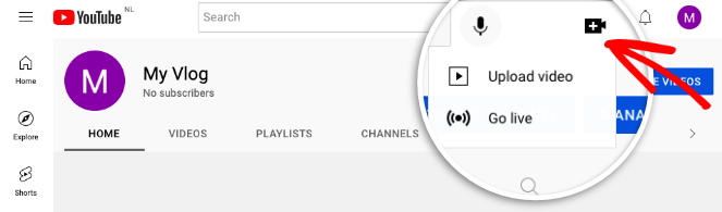 Now that your channel is set up, it’s time to publish your first video. In your YouTube account, click on the Create a video icon at the top right-hand corner of the screen.