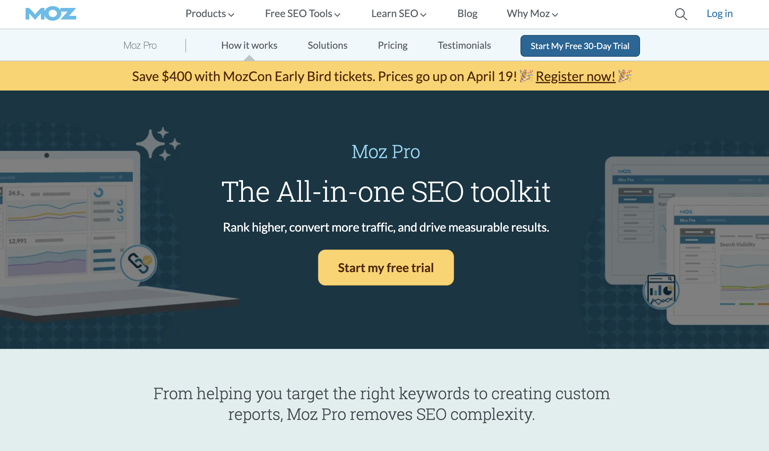 Moz Pro is powerful SEO software that offers tools and resources for smart marketing. It helps you increase blog traffic, rankings, and visibility in the search results. It has tools for all your needs and wants to improve your blog’s search engine rankings.