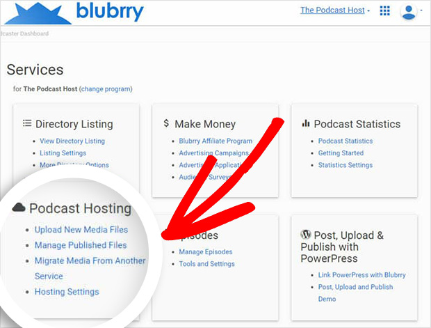 To upload your files, simply log in into your Blubrry account and then go to the Podcaster Dashboard » Podcast Hosting » Upload New Media Files.