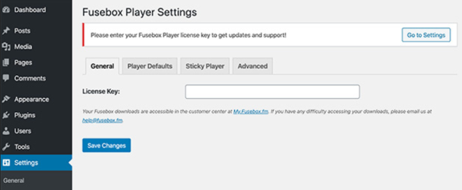 Once you’ve installed and activated the plugin, go to Settings » Fusebox Player. If you have the paid version, you need to enter your license key first.