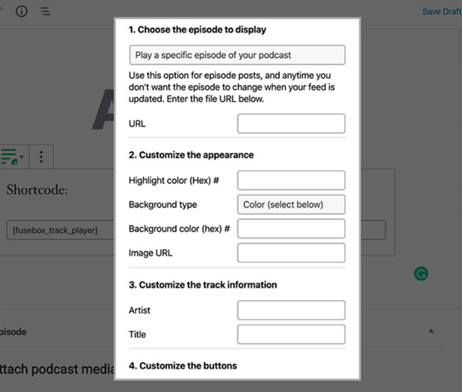 This creates a shortcode for Fusebox so you can display individual podcast episodes. Now you can configure the shortcode by clicking on Edit Shortcode under the Shortcode Builder heading on the right side.