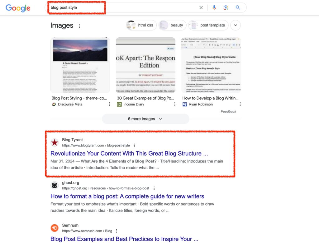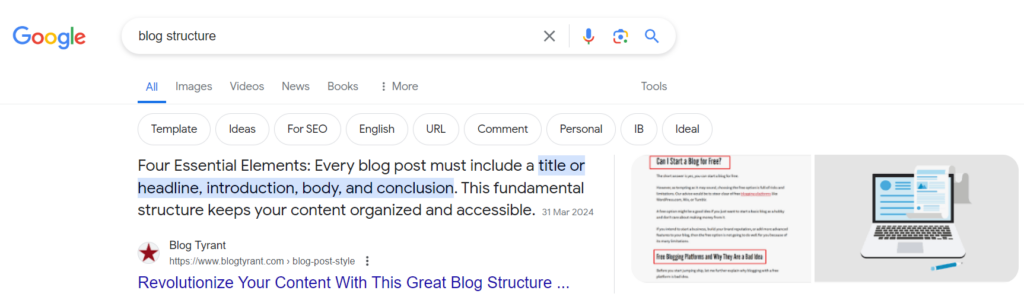For example, if you search for “blog structure,” Blog Tyrant will appear at the top of search results because we optimized for that keyword.