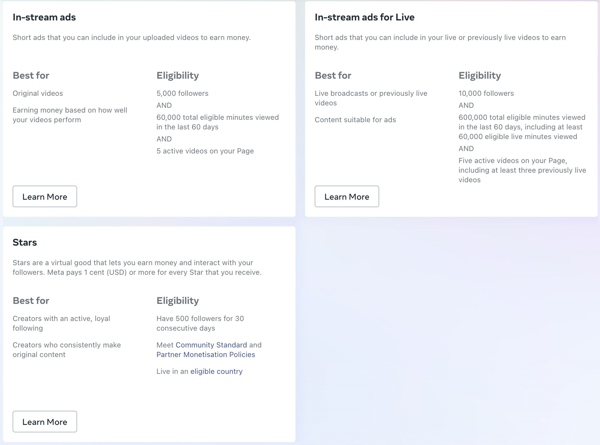 And as long as you’re compliant with Facebook’s monetization policies, you can earn thousands of dollars each month from views, comments, reactions, and shares on your posts. (Meta recently lifted a $30k cap, so there’s no real limit for how much you can make). But just note that Reels and Stories are not monetizable with this program.