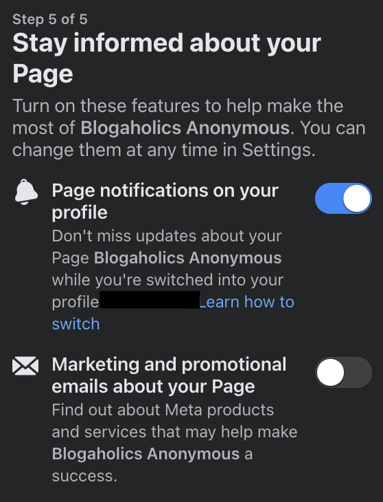 11. Last step of the set up is choosing whether you want to receive Facebook notifications as well as marketing info emailed to you.