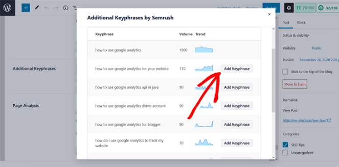 SEMrush will show you additional and related keywords along with their performance right from your site. You can add any of these keywords to your content with 1 click.