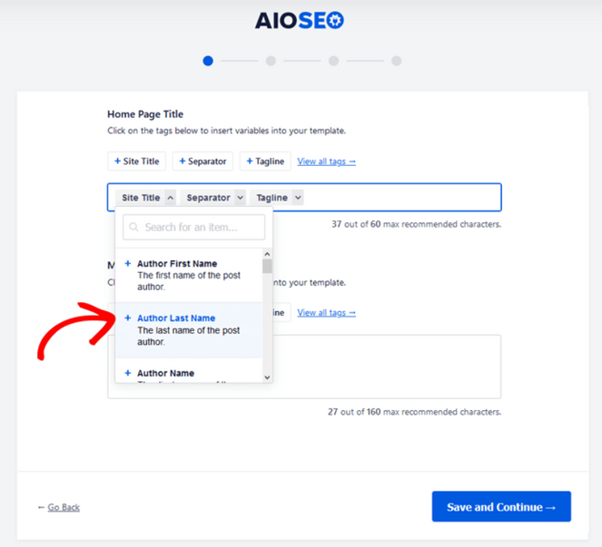 For example, you can click on the +Site Title tag and choose other variables like +Tagline and +Author Last Name to automatically add them to your home page title.