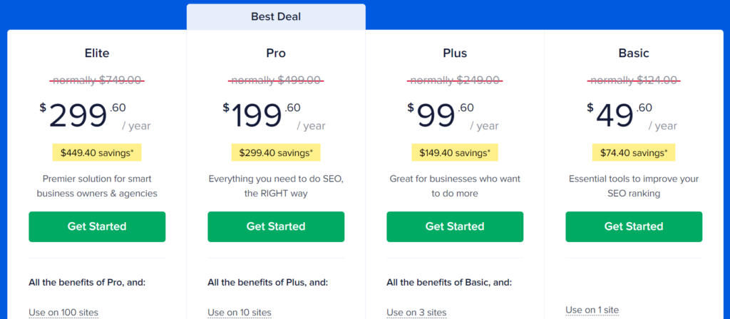 You can get started with the Basic plan for only $49.60 per year. This includes a single site license, unlimited keywords, advanced SEO modules, social media integration, TruSEO Analysis, and more.