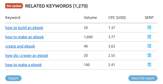 For example, if you research this article, you’ll find the related keywords, “make an ebook,” “create an ebook,” and “write an ebook” all have different search volumes: