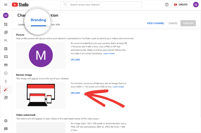 Next, head under the Branding tab. It’s important to add a picture and banner here that’s relevant to your blog. This will serve as your branding and allow users to identify your channel and understand what it’s all about.