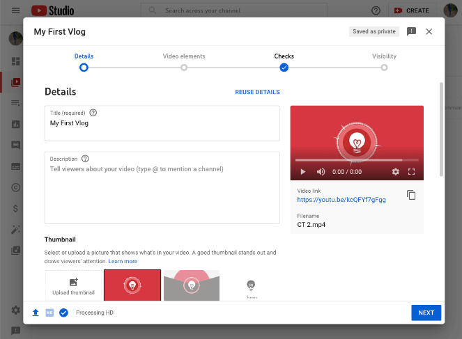 First, add a title and description that’s catchy and accurately explains your content. Then, choose a thumbnail from within the video (or create one on Canva) and upload that too. It’s worth noting here that when you upload subsequent videos, there’s an option that lets you reuse data you’ve already entered for previous videos.
