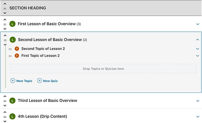 LearnDash makes it easy to create courses with its drag and drop course builder. You can use it to create lessons, topics, and quizzes and then arrange them together in a complete course.