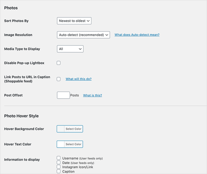 • Photos: Sort your photos by random, likes, or newest to oldest. Set your image size and choose the photos you want to show. You can link posts to a URL in the image captions so visitors can shop through your gallery as well.