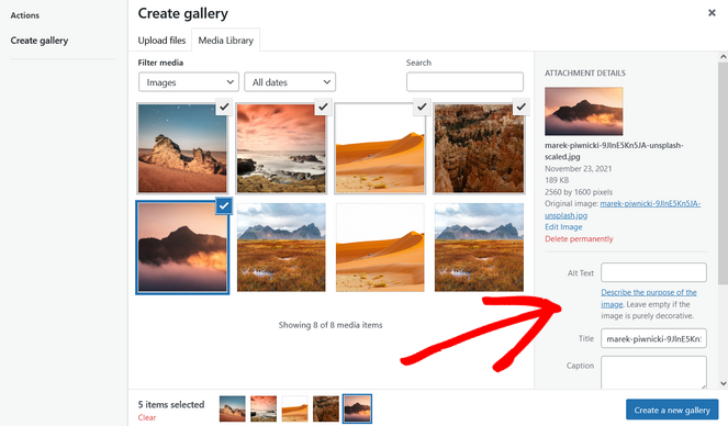 When choosing files from your media library, you can also enter information like the title, alt text, description, and caption to optimize your images for SEO.