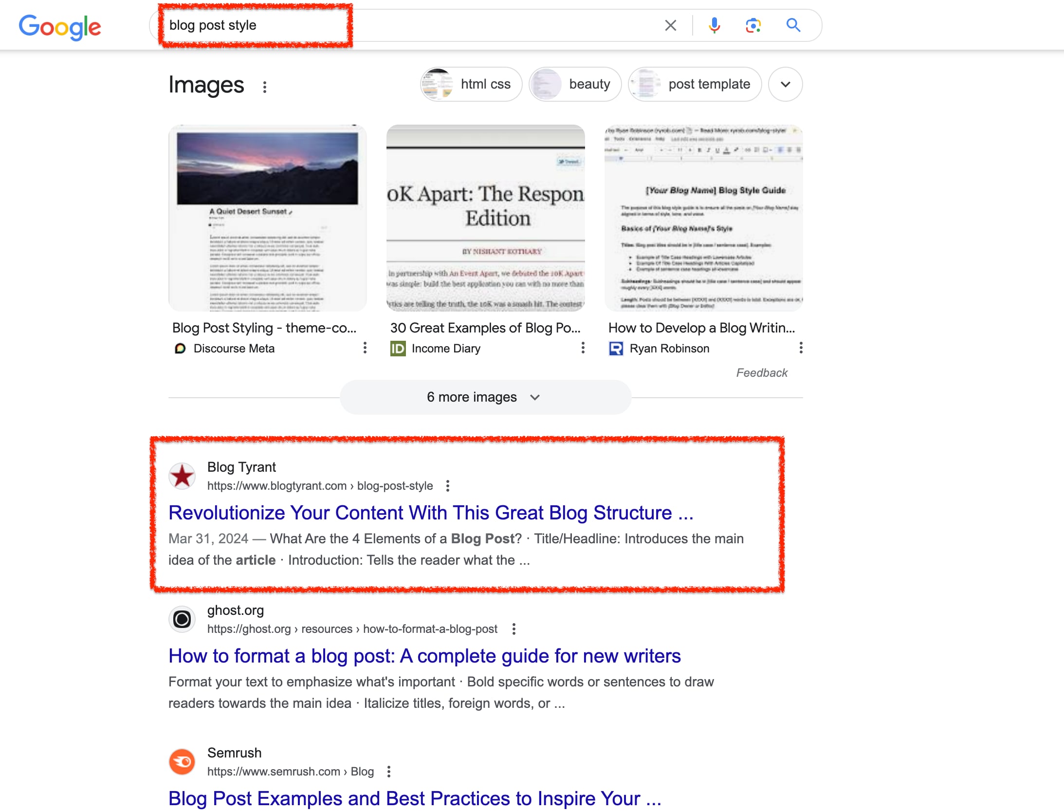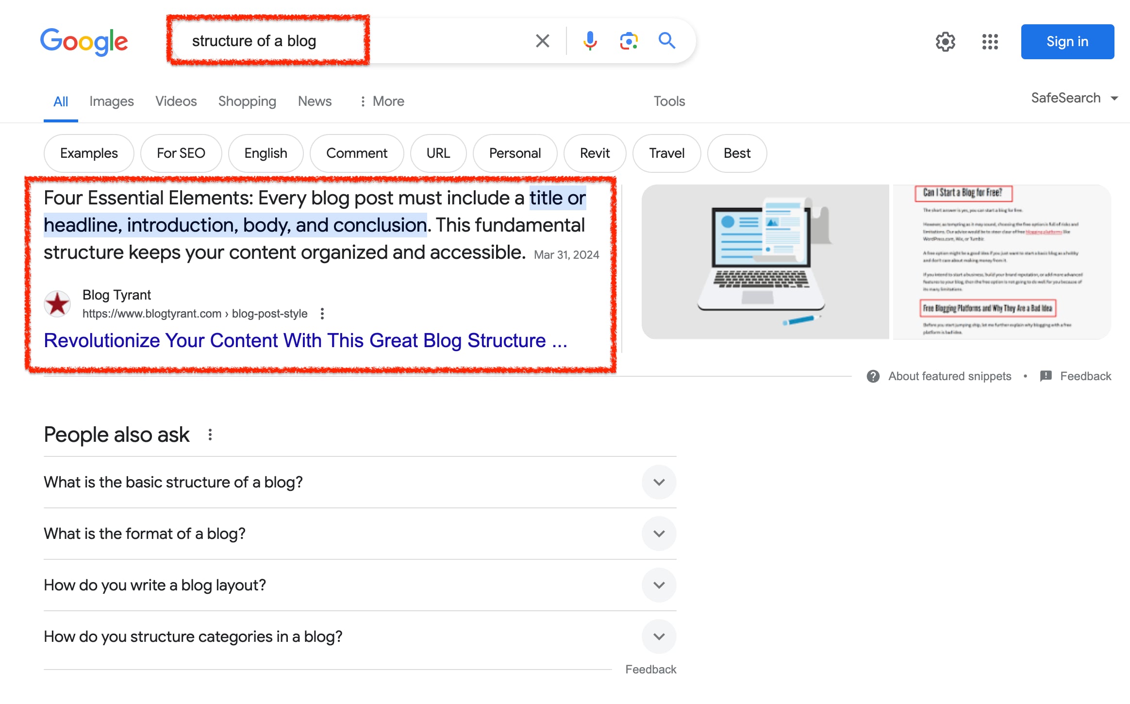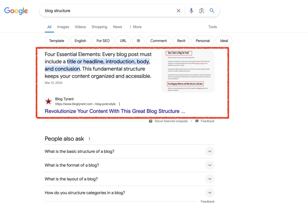 For example, if you search for “blog structure,” Blog Tyrant will appear at the top of search results because we optimized for that keyword.